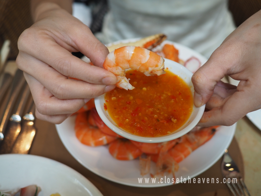 ซีฟู้ดเย็นบุ๊งตักมาแต่ หอยนางรมสด กุ้งและขาปูอลาสก้า ซึ่งเนื้อกุ้งสดแน่นทุกตัว และขาปูไม่เค็ม