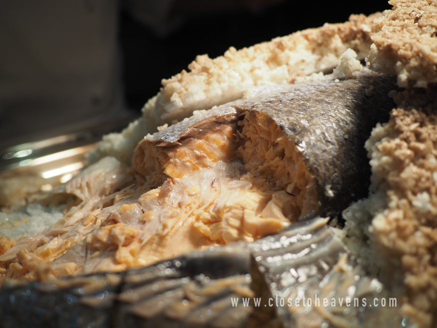 ปลาแซลมอนตัวใหญ่มาก โพกเกลือแล้วอบจนสุก