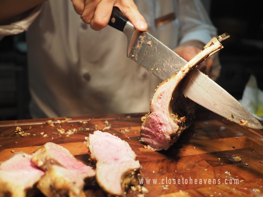 ซี่โครงแกะย่าง หากใครต้องการให้สุกเพิ่ม เชฟก็จะนำไปย่างให้อีกตามต้องการ เนื้อวัวก็เช่นกัน