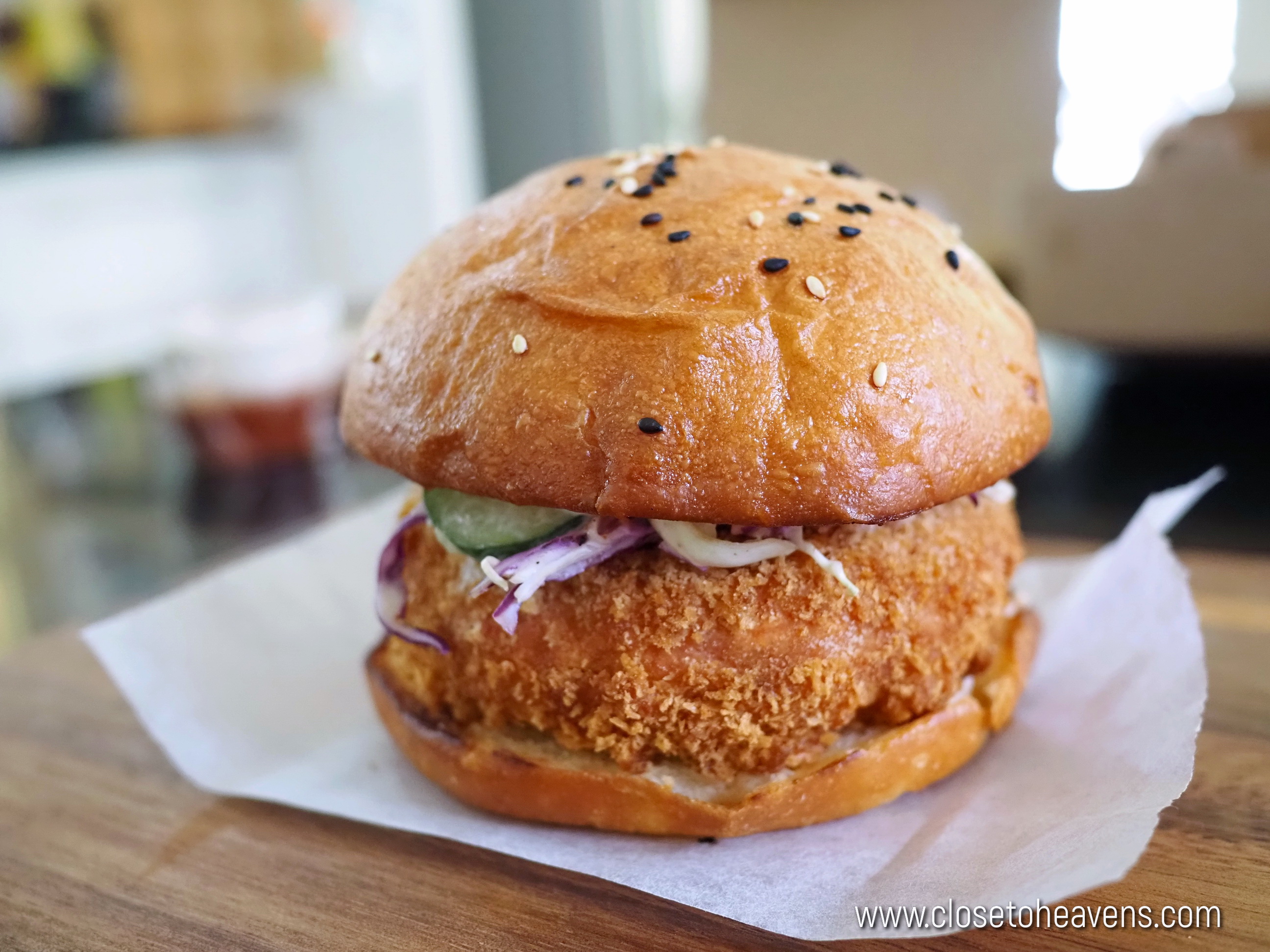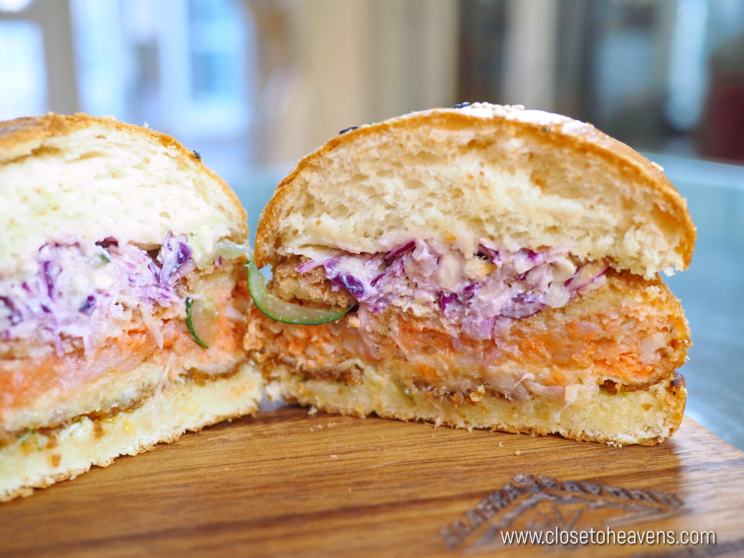 เบอร์เกอร์แซลมอนอลาสก้า ชิ้นใหญ่เกือบเท่าหน้าบุ๊งเลยค่ะ ตัว bun เป็นแป้ง brioche (บริยอชบัน) แบบโฮมเมด เสิร์ฟพร้อมเนื้อปลาแซลมอนอลาสก้าและกุ้ง ตัว salmon patty นำไปชุบเกล็ดขนมปัง ทอดแบบกรอบนอกนุ่มใน โปะด้วย coleslaw ทานคู่กับซอสทาร์ทาร์ เข้ากันที่สุด